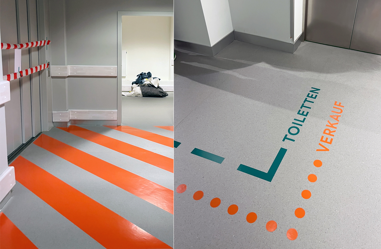Ein bekanntes Einkaufszentrum in Ludwigsburg erhält Wegeleitmarkierungen in Sonderfarben im Kundenbereich.