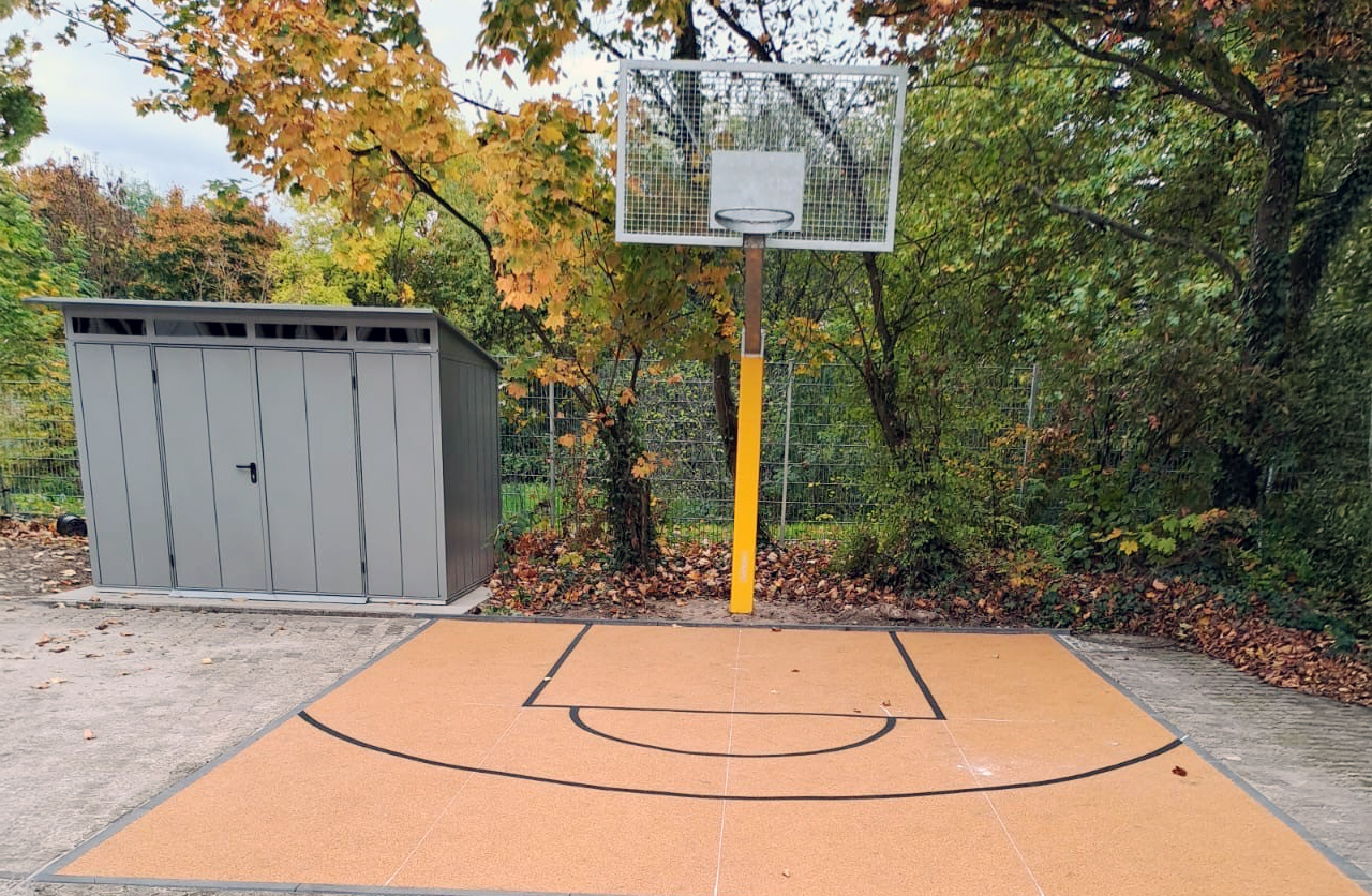 Streetballfeld-Markierung auf Gummi-Bodenbeschichtung EPDM in Dillingen. Wir wünschen allen viel Spaß beim Basketball spielen.