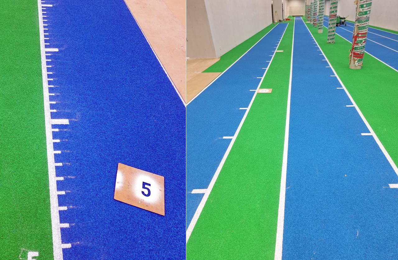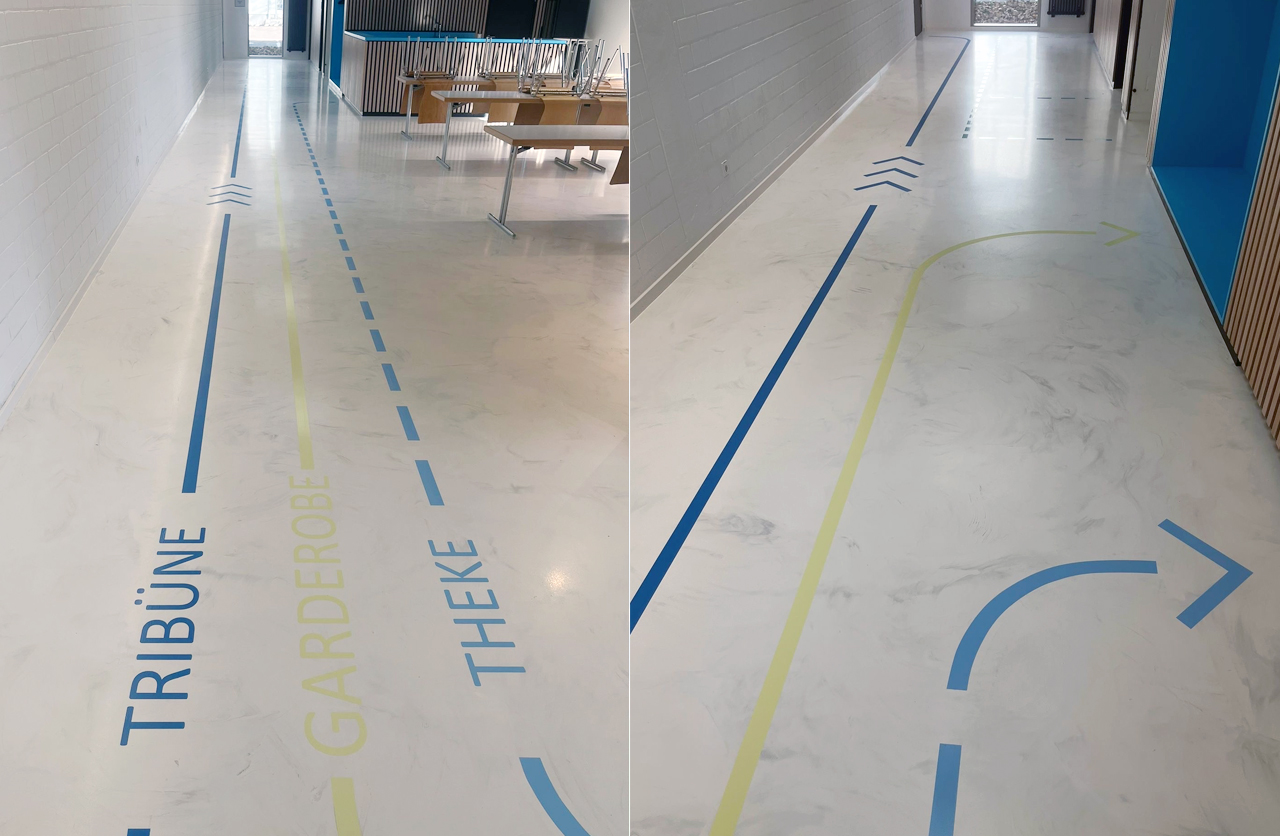 Die Sporthalle in Ostfildern / Kemnat erhält neue Wegleitmarkierungen in Sonderfarben.